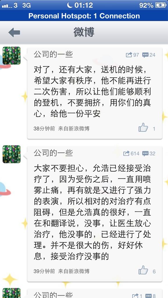 多くの方々が心配しておられて便り上げます。 現在のユンホは筋肉痛でマッサージなど可能な応急処置を受けるところで、筋肉痛がワイヤー事故による負傷ではないと思う。 ひとまず現在の確認された状況はここまでです。