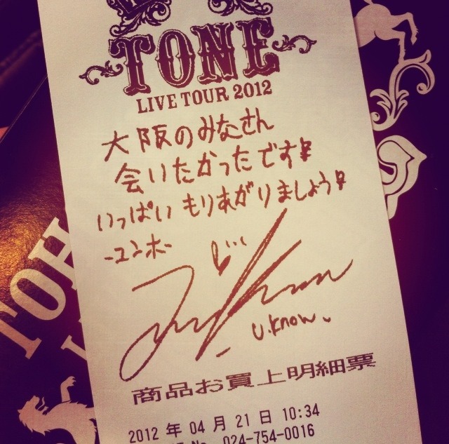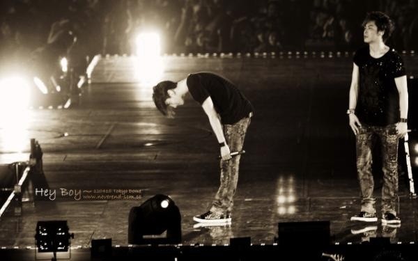 東方神起のあるファンが16日、東方神起のユンホとチャンミンが写った3枚の写真をツイッターに投稿した。写真はいずれも、現在開催中の全国ツアー「東方神起 Live Tour 2012 ~ TONE ~」のステージに立つ2人の写真で、2人は深くファンへ感謝を示してお辞儀をしている。