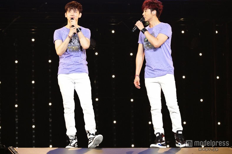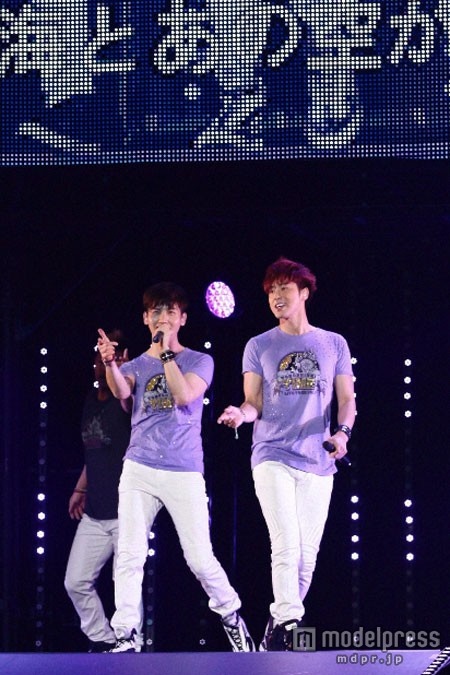 さいたまスーパーアリーナにて「東方神起LIVE TOUR 2013~TIME~」を開催した東方神起(左から:チャンミン、ユンホ)スタジアム公演の追加により、今ツアーは5大ドームを含む全国7か所18公演、自己最高記録の85万人を動員。日本デビュー9年目にしてドームツアー、スタジアム公演という2つの夢舞台を叶えることとなった2人は「この夢を乗り越えて、新しい夢を追いかけたらいいんじゃないかなと思います!」(ユンホ)、「みなさんの声援で、夏の暑さをふっ飛ばしていきたいと思います!」(チャンミン)と力強く宣言し、3万2千人の観客を沸かせた。