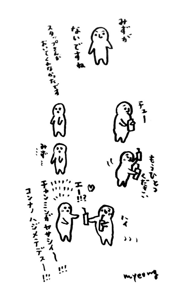 ・ステージにいつもあるお水が今日はなかった。ユノ「スタッフさんも緊張して忘れちゃったんですね。」チャンミン「今日はサイショビ(最初日)だから。」サイショビwww 可愛い♡