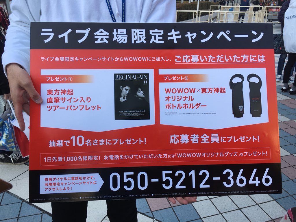 WOWOWブースは050-5212-3646に電話してショートメールが返ってくるのでそこからログインしたらサイン入りパンフレットプレゼント。そして会場では先着1000名にボールペンプレゼント。東方神起が表紙のWOWOW冊子もくれるよ。