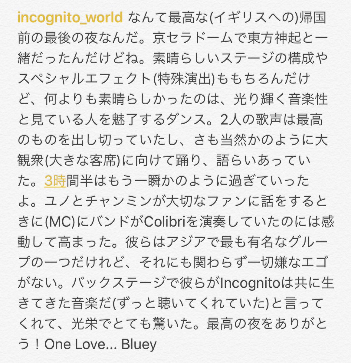 京セラ公演を観に来ていたIncognitoのBlueyのインスタ。イギリスのファンクジャズの大御所で神みたいな人。すっごい褒めてくださってる。「何よりも素晴らしかったのは輝く音楽性と、人を魅了するダンス」「アジアで最も有名なグループの一つなのに、一切嫌なエゴがない」