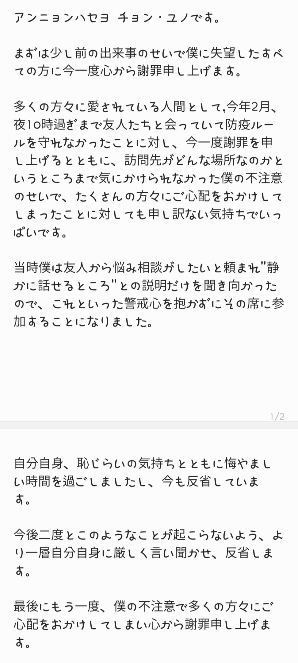 多くの方々に愛を受けている人として、去る2月夜10時以後まで友達らと集いを持って防疫規則遵守を守ることができない点に対してもう一度謝罪申し上げて、訪問した場所に対して調べることが出来なかった私の手落ちによって多くの方々に心配をかけた点もとても申し訳ない気持ちだけです。