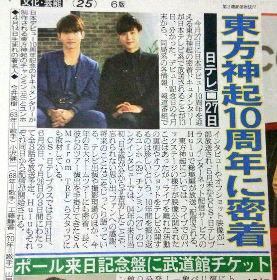 今月27日に日本デビュー10周年を迎える東方神起の密着ドキュメンタリーが日本テレビ系で放送されることが13日、分かった。デビュー記念日の今月末から、同局系の各情報、報道番組でインタビューやオフショット映像が一部放送され、5月末からCS・日テレプラス、インターネット配信サービスのHuluで総集編が放送、配信される。