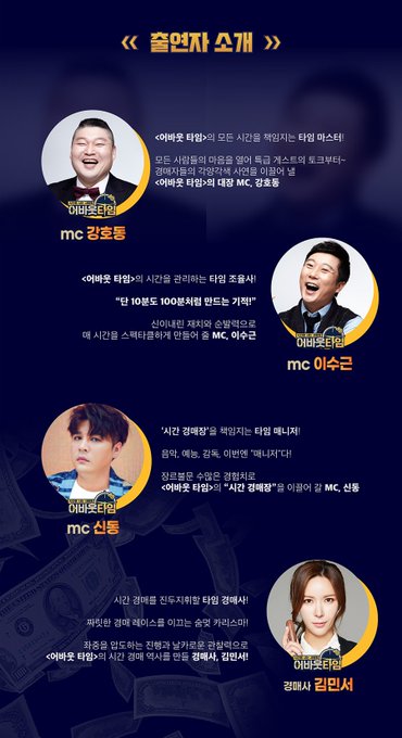 10月6日 新番組About TimeのメインMCは おなじみのカン・ホドンさん、イ・スグンさん 痩せてカッコよくなったシンドン兄 ユノの時間を最大100分購入できる