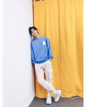 写真の中のユンホは、爽やかなブルーのトレーナーにオフホワイトのパンツといった装い。左胸のワンポイントやパンツと同系色のスニーカーが、絶妙な“こなれ感”を演出している。