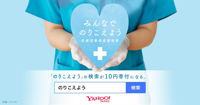 れた方おひとりにつき10円を、Yahoo! JAPANから医療従事者の支援活動に寄付いたします。#新型コロナ #みんなでのりこえよう #医療従事者感謝検索