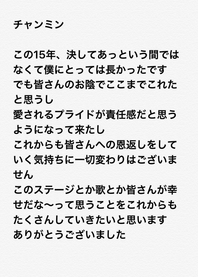 (∵)ここにいるユノ、チャンミン、東方神起、ビギスト一緒に綺麗な道を目指していこう。完璧じゃなくていいから、泣いたり転んだり怒ったりしてかっこいい道をゆっくり歩いていこう、今日もみんなのおかげで良い足跡ができたよ