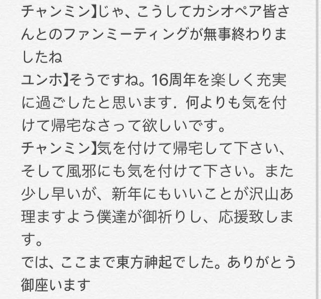 ・今までのファンミーティングとか他のイベントと違って今まで見ることが感じることがなかなか難しかったユンホとチャンミンのありのままのやりとりを見てるようだったのでそれはそれなりにショックというか、とにかく新鮮で萌萌すぎて。当たり前たがやはり互いのことは互いが一番知ってて思ってる!
