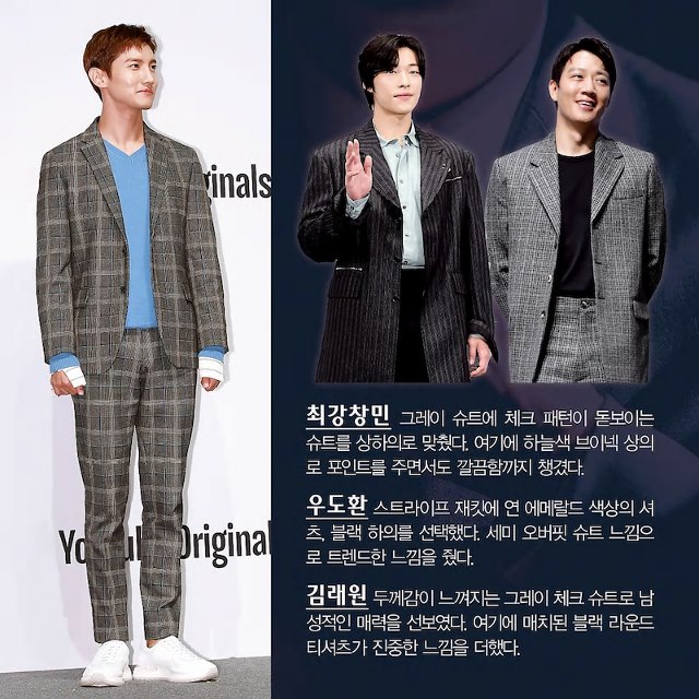 チェガン・チャンミン:グレーシュートにチェック パターンが引き立って見えるシュートを上下着で合わせた。 ここに空色ブイネック相談でポイントを与えながらもすっきりしているということまで取りまとめた。