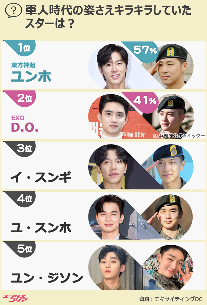 3月28日から4月3日にかけて七日間にわたり、コミュニティー・ポータルサイト「DCインサイド」と検索サイトを手掛けるマイ・セレブズが運営している「エキサイティングDC」が「軍人だったときの姿さえキラキラしていたスターは?」というテーマで投票を実施した。その結果、ユンホは得票率57%(1万4416票)で圧倒的な強さを見せ、1位になった。