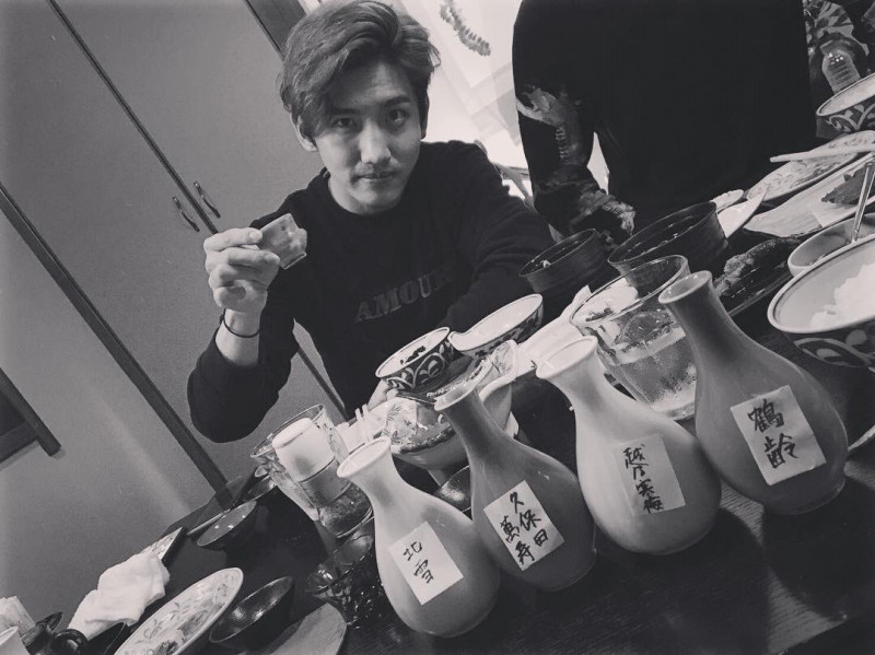 ・チャンミンがAmoreが赤字で書かれた黒トレーナーで日本酒を飲んでる写真