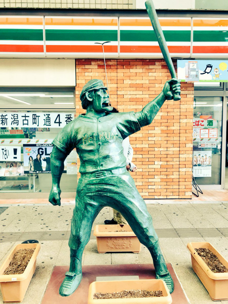 ・Tを探せで葉っぱ咥えてるドカベン岩鬼の銅像写真。