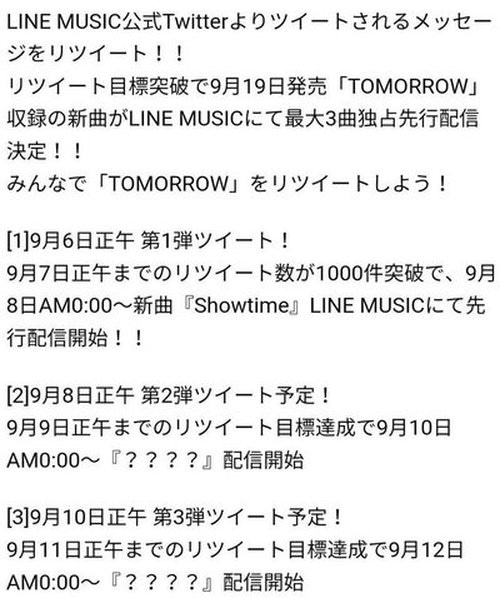 リツイート目標突破で9月19日発売「TOMORROW」収録の新曲がLINE MUSICにて最大3曲独占先行配信決定!!