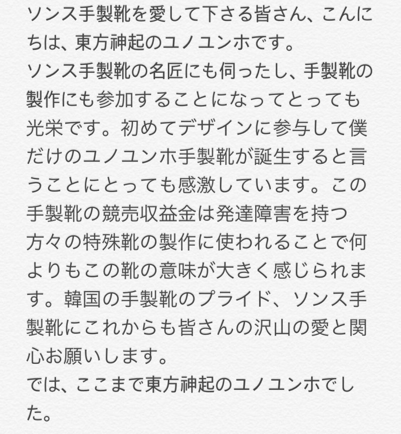 ユンホの手製靴3足のうち1足は12月、聖水手製靴ホームページで行われ寄付オークションイベントを通じて、販売される。販売金は発達障害者のための特殊手製靴製作費用として全額寄付される。残りの1足は聖水手製靴希望プラットフォーム広報館に9月から2019年まで展示される。