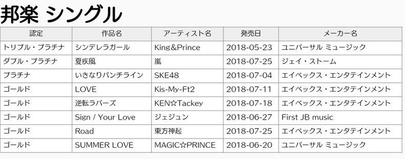 日本レコード協会は8月10日、以下のとおり「18年7月度ゴールドディスク認定」を発表した。