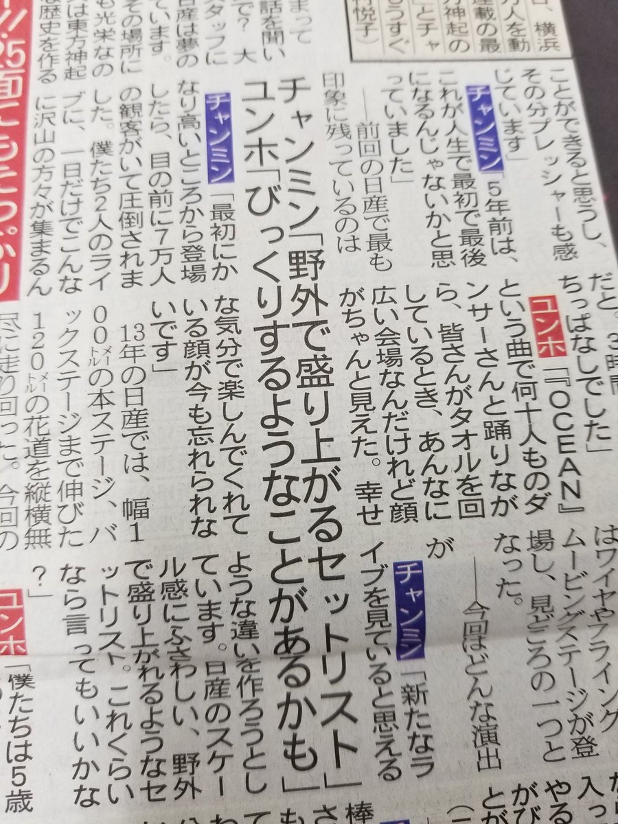 チャンミン「新たなライブを見ていると思えるような違いを作ろうとしています。日産のスケール感にふさわしい、野外で盛り上がれるようなセットリスト。これくらいなら言ってもいいかな?」