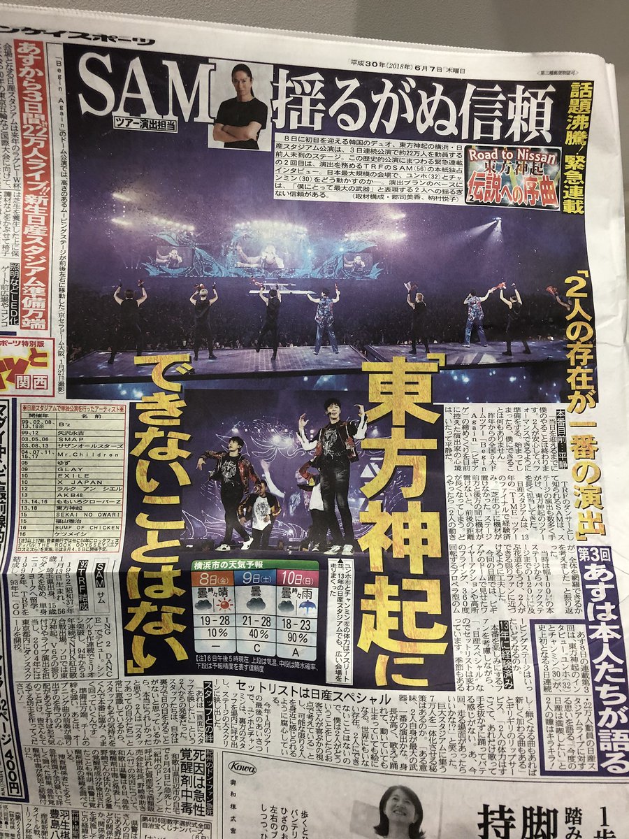 8日に初日を迎える韓国のデュオ、東方神起の横浜・日産スタジアム公演は、3日連続公演で約22万人を動員する前人未到のステージ。この歴史的公演にまつわる緊急連載の2回目は、演出を務めるダンスグループ、TRFのSAM(56)のサンケイスポーツ独占インタビュー。日本最大規模の会場で、ユンホ(32)とチャンミン(30)をどう動かすのか-。演出プランのベースには、「僕にとって最大の武器」と表現する2人への揺るぎない信頼がある。