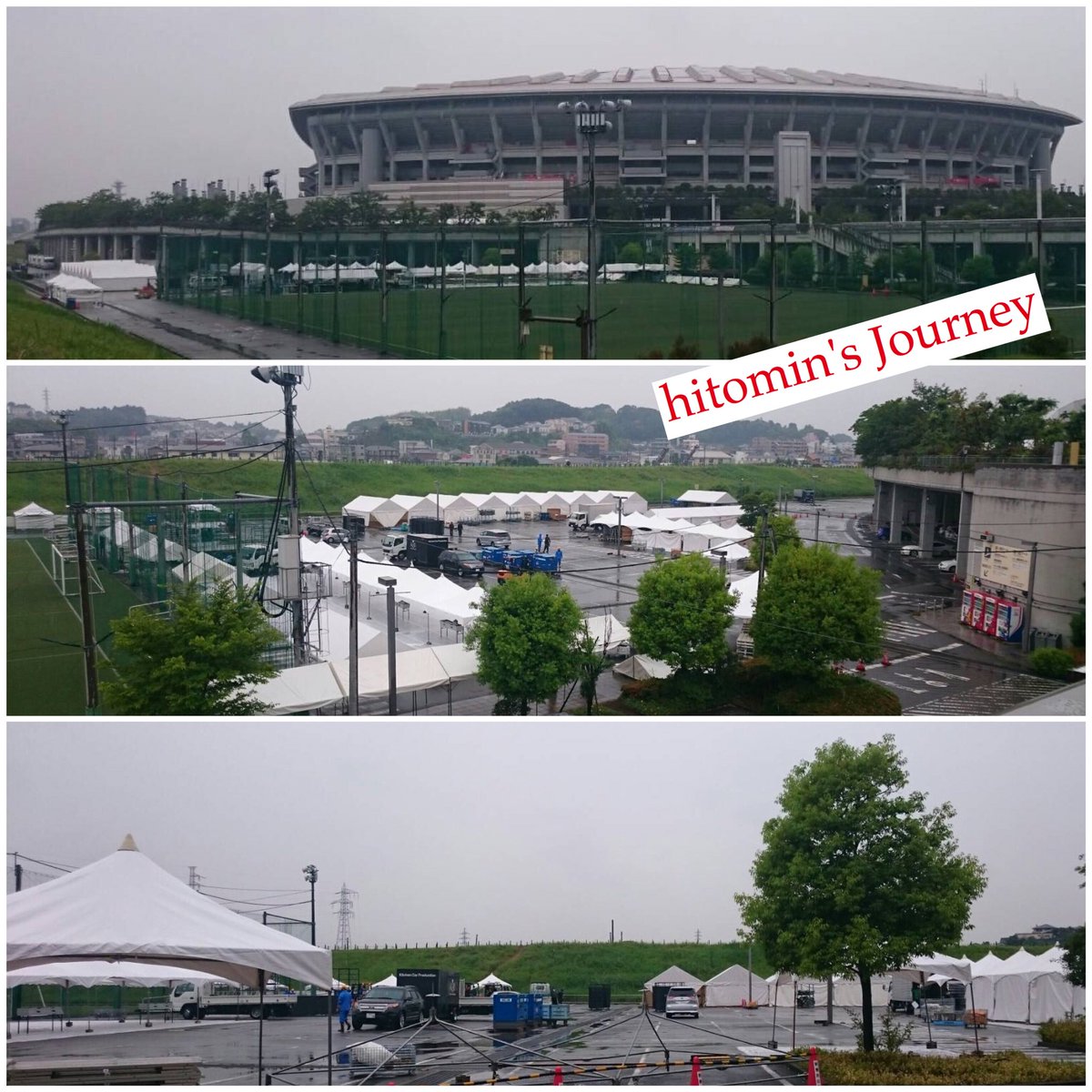 夕闇迫る中、バックステージで歌い踊るユンホ(左)とチャンミン。後方に見えるのが本ステージ=横浜・日産スタジアム(2013年撮影)【拡大】
