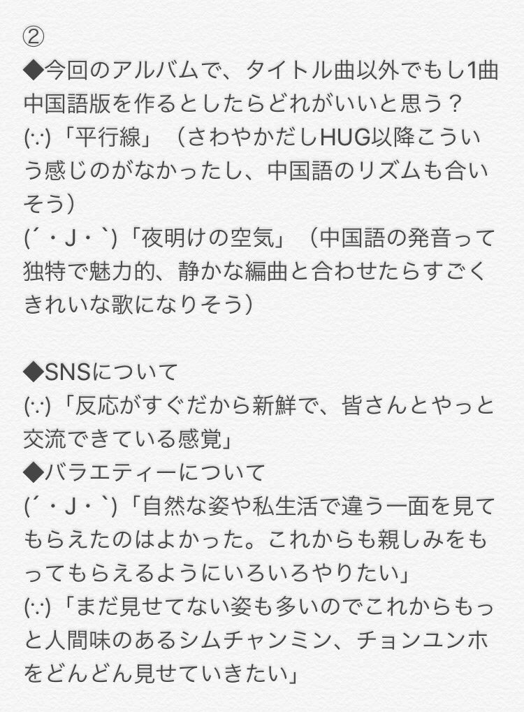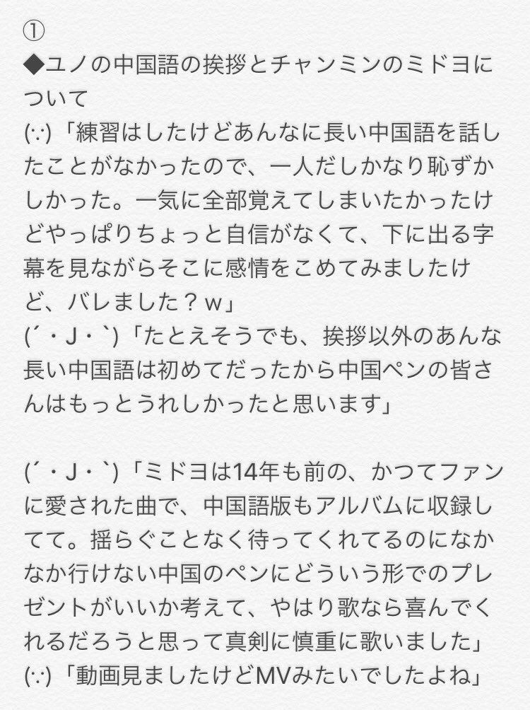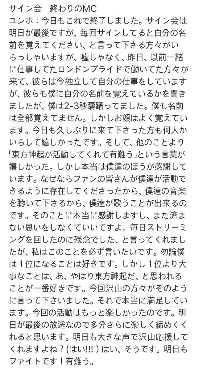 ・ユンホが今日本当に済まない気持ちでいらした方々が多いようだと言い、ストリーミング沢山したのに申し訳ないと言って下さったが、勿論僕は1位になったらいいでしょうが、しかし今回の活動本当に楽しかった、と言った。むしろユンホ自身がもっと有難いと言ってくれた。有難う、ユンホ。