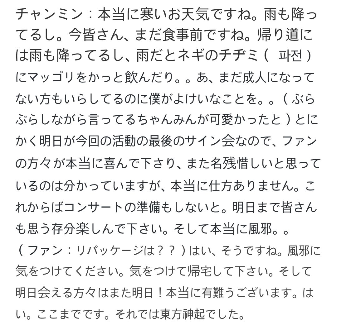 今日チャンミンに惚れ直したが、ユンホの具合がちょっとよくないからそのバランスをとるようにサイン会始めからファンの色んなお願いを聞いてくれて、リアクションもずっと大きく、優しく長い会話してくれた。その心が感じられて本当に最高のデュオだと思うし、愛するしかないと思った。