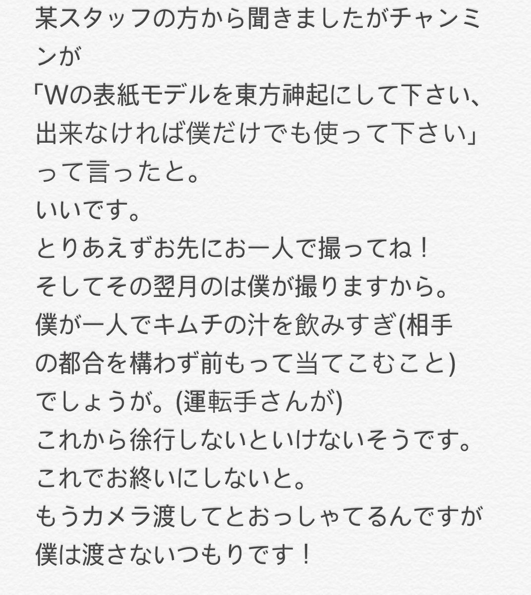 W読者の皆さん、こんにちは、東方神起のチャンミンです