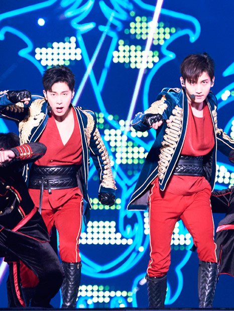 パンッという音で我に返ると、メインステージの両端にユンホとチャンミン。ショータイムの始まりだ。